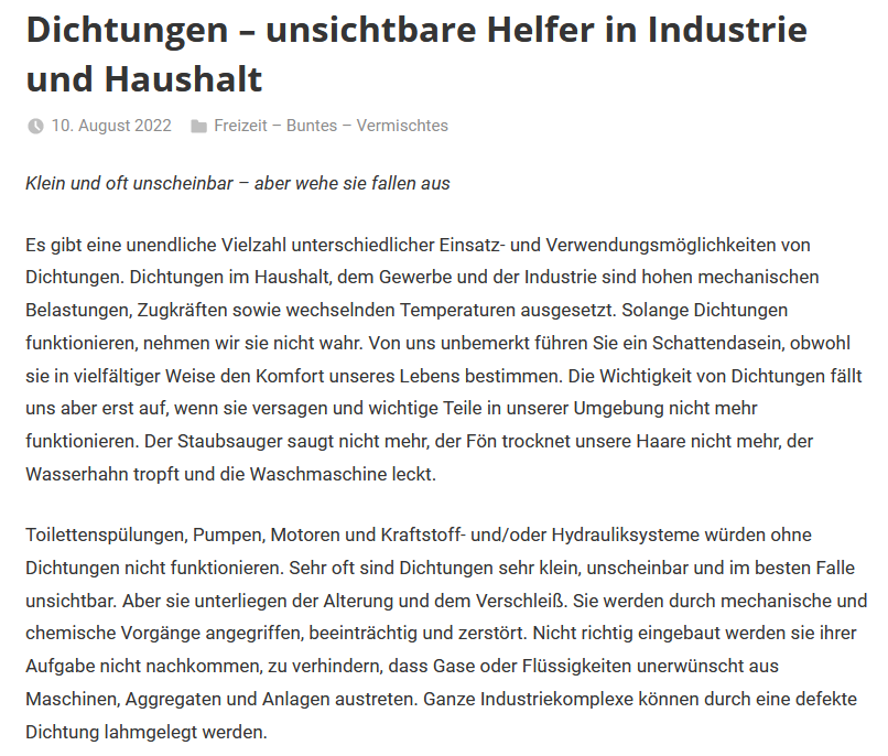 Dichtungstechnik Habermann 10.08.2022 "Dichtungen - unsichtbare Helfer in Industrie und Haushalt"