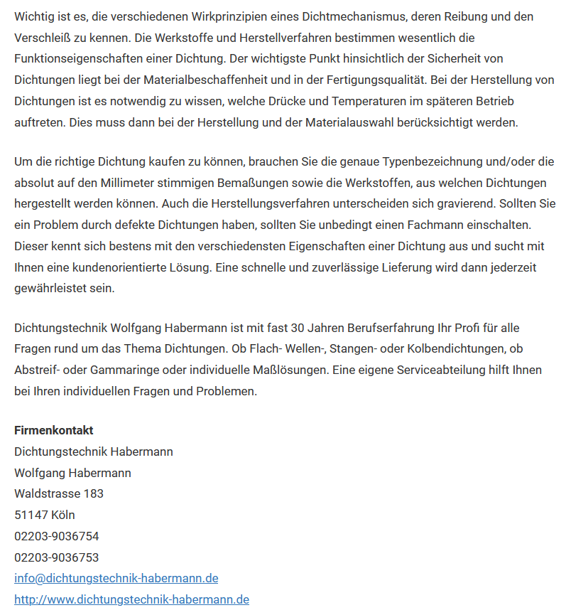 PDF Download Dichtungstechnik Habermann			        "Defekte Dichtungen - ein unterschätztes Problem im Alltag"	 78 mal veröffentlichtBusiness-Panorama WirtschaftsnachrichtenUnternehmen HeuteFirmenpressePresse-BoardPressNetworkBuisinesspress ONMedien-NewsTechnik 247News8INARu.v.m. <-- Bitte Artikel anklicken PDF Download PDF Download Dichtungstechnik Habermann			        18.05.2017"Defekte Dichtungen – warum oft der Fachmann ran muss"	 PDF Download <-- Bitte Artikel anklicken Erschienen u.a. in: umwelt-panorama.deKöln-News Spielzeuge.de Internet-News-123 Technik-247.de OnPrNews.com   Presse-Board.de Verbraucherpresse.com Links-im-Internet Online-Zeitung.de Weltjournal.de Nachrichten.net  und vielen mehr… Deutschland-247.de Auto-und-Motorrad-Teile Bestenliste.info